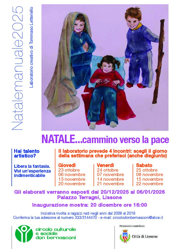 E’ ormai una consuetudine il laboratorio “Natale Manuale” curato da Tommaso Letteriello dove bambini e ragazzi sono invitati a produrre un manufatto ispirato alla festività. Si terrà in Ottobre e Novembre.