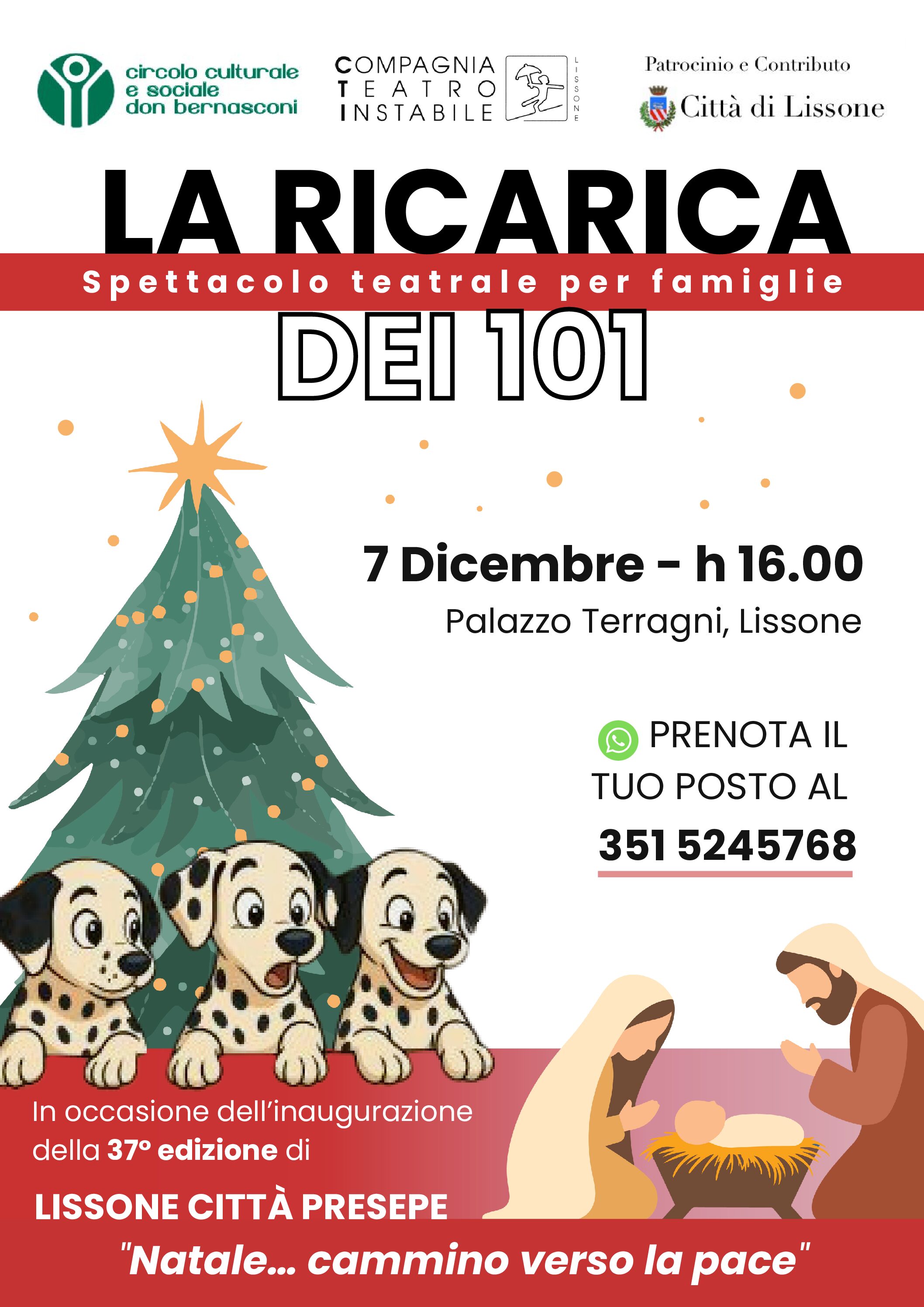 Come da tradizione, domenica 7/12, avrà ufficialmente inizio la 37a edizione di “Lissone Città Presepe”. L’inaugurazione si terrà a palazzo Terragni, ore 16:00. In questa occasione, la Compagnia Teatro Instabile metterà in scena “La Ricarica dei 101”: spettacolo teatrale per bambini e famiglie.